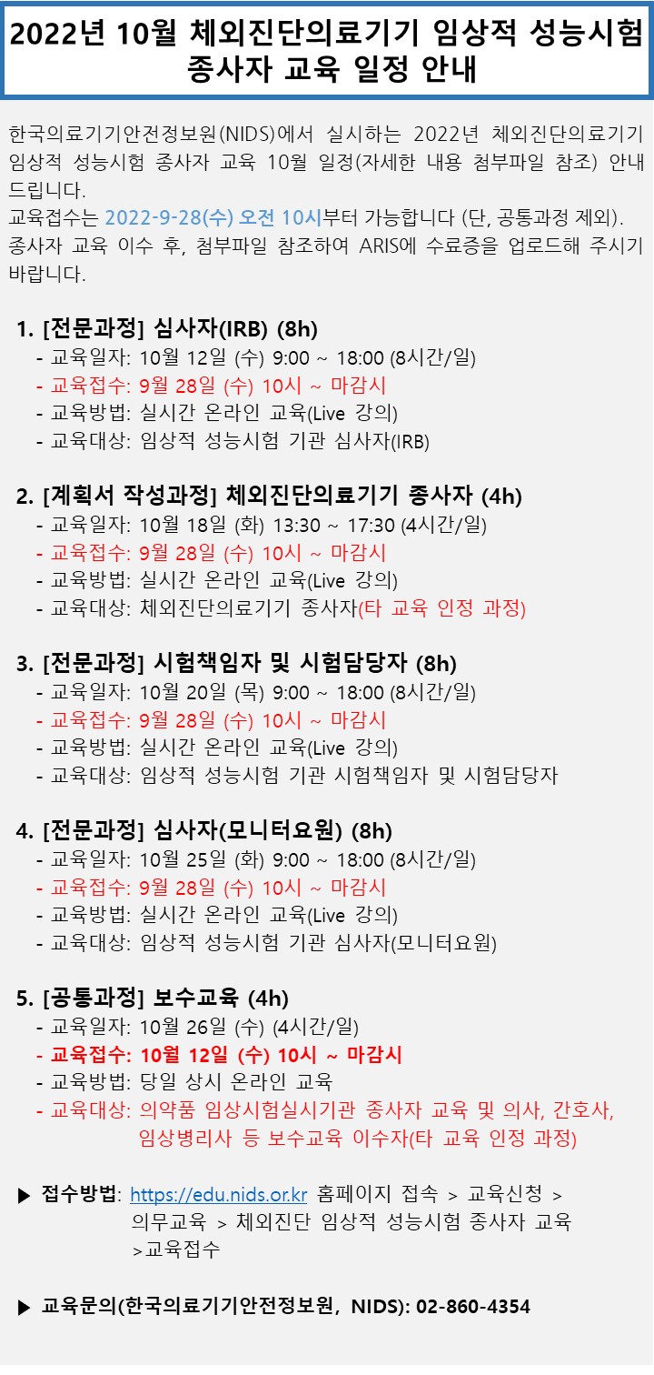 [교육안내] 10월 체외진단의료기기 임상적 성능시험 종사자 교육 일정(9/28(수) 오전 10시~)