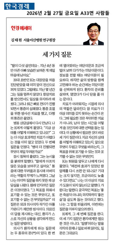 [NEWS] 한경에세이 "세가지 질문" (한국경제 A33면 사람들/2026.02.27)